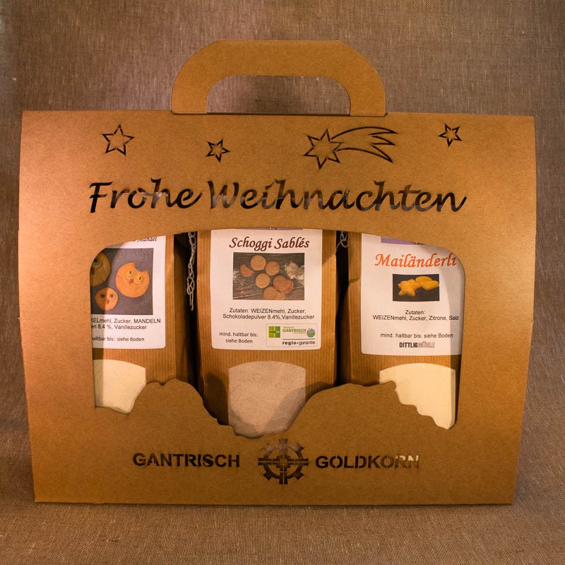 Geschenkverpackung zum selber befüllen mit 3 Backmischungen und/oder Müesli. Aus Karton (Recycling, hergestellt in der Schweiz). Der Karton wird gefaltet geliefert und kann zu einer Tasche zusammen gesteckt werden. Achtung: dies ist nur die Verpackung, der Inhalt muss mitbestellt werden!