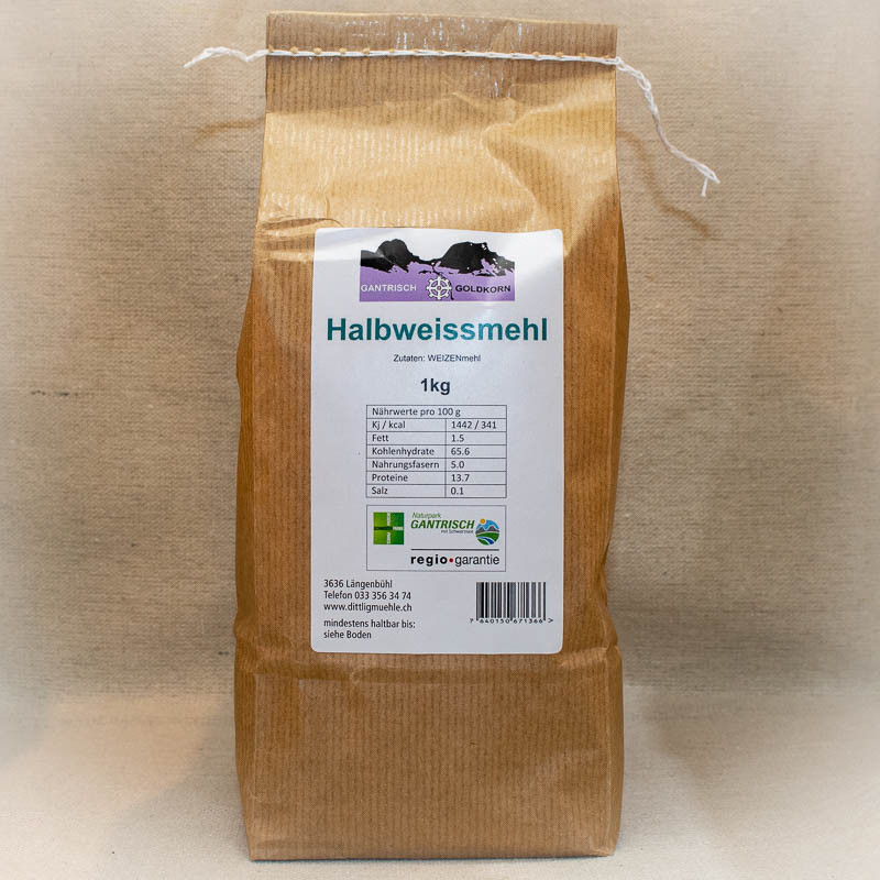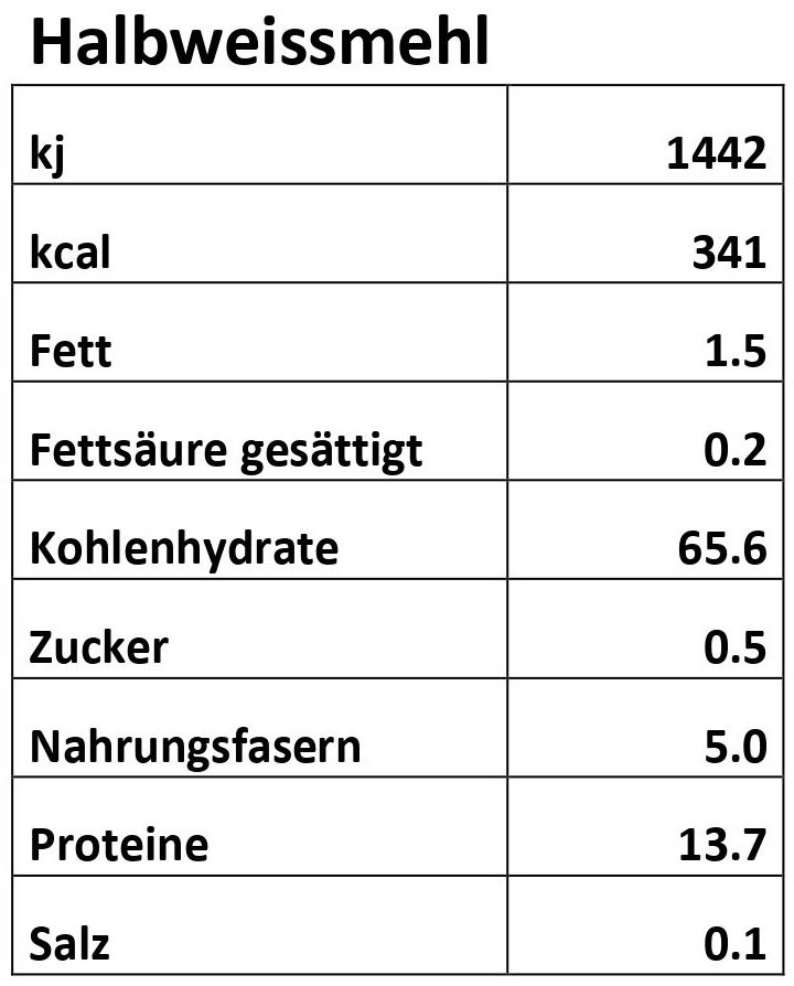Das Halbweissmehl enthält mehr Schalenteile und Mineralstoffe als Weissmehl. Dies ergibt Brote mit ausgeprägterem Weizenaroma. Dieses Mehl eignet sich für Mischbrote, sowie hellere Brote und dient als Grundlage für Mehlmischungen. Auch zur Herstellung von Kuchen, Guetzli und zum Binden von Saucen. Entspricht ungefähr dem Typ 700.